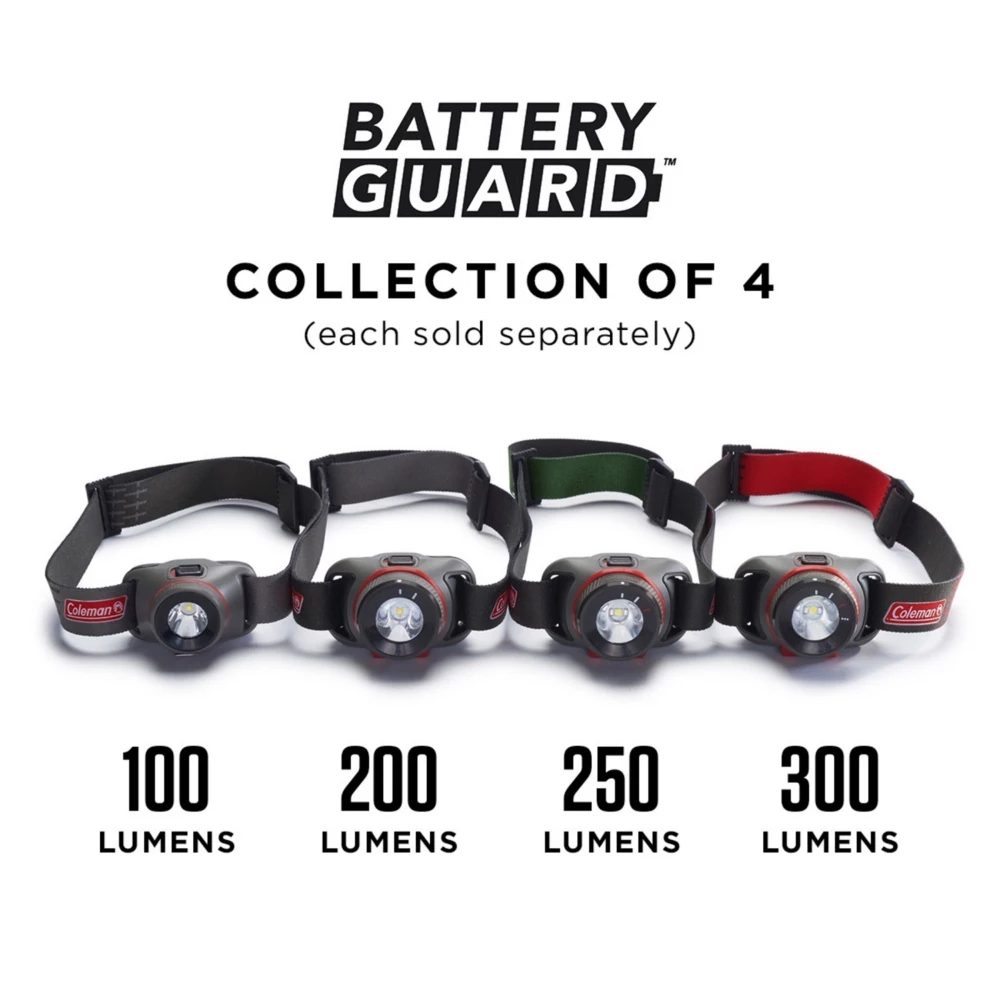 The Coleman® 100 Lumens LED Headlamp with BatteryGuard™ stops battery drain, so you’ll have power when you need it most. BatteryGuard technology automatically disengages batteries from the circuit to extend battery life by 25%, and it reduces corrosion so batteries can be stored in the device for years (up to their inherent shelf life). You can trust that your BatteryGuard headlamp will be ready for anything, even when you’re not.
