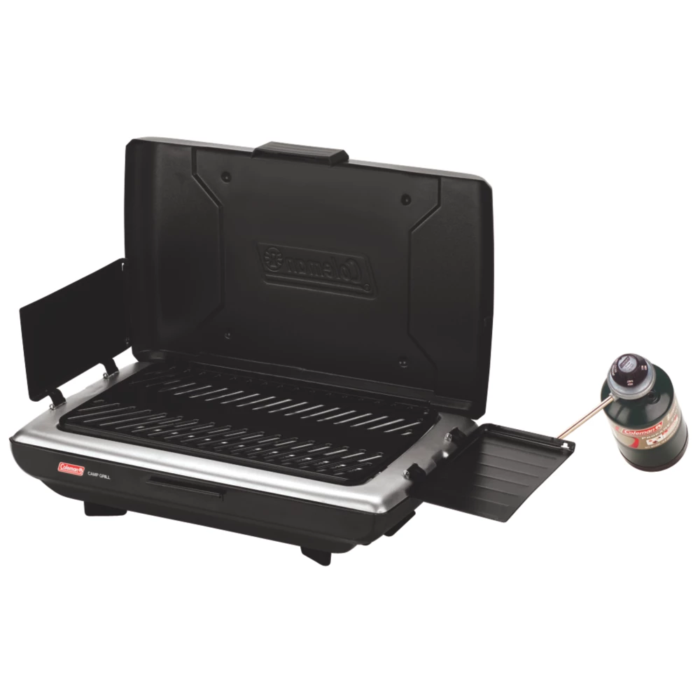 Portable yet powerful, the Coleman® Camp Propane Grill is just what you need at the campsite, tailgate, or backyard BBQ. Cook up all the burgers, veggies, and anything your crew’s craving with the spacious 180 sq. in. of cooking surface. You’ll love the 11,000 BTUs of adjustable cooking power and the PerfectFlow™ pressure control technology that keeps the heat steady, even in extreme conditions. WindBlock™ panels help shield your flame from wind and also fold down to use as side tables for all your prep work. When you’re done cooking, the porcelain-coated surface and drip tray are both removable for easy cleanups.
