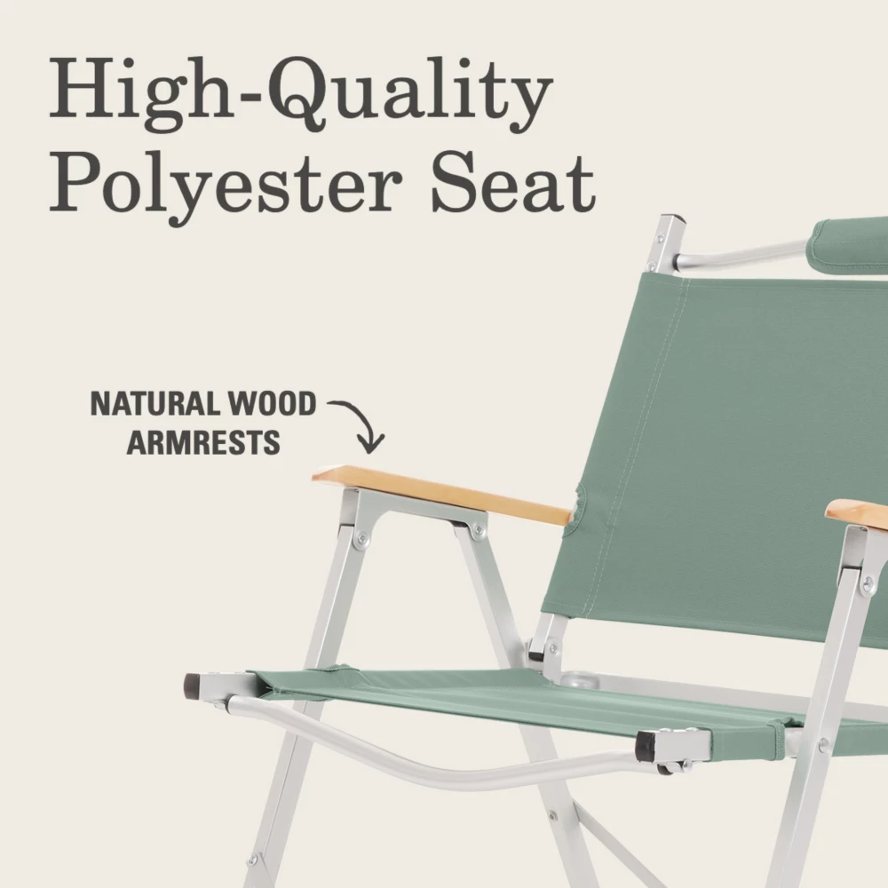 Sit back and relax in comfort and style in the backyard or at the campsite with the versatile Coleman® Living Collection Flat-Fold Chair. The lightweight frame and carry handle make it easy to move while also being sturdy enough to support 250 lbs. Designed to be low to the ground with a short seat height, the chair is perfect for lounging outside for hours with a good book or even better company. Natural wood armrests add a stylish look that’s perfect for the patio or a glamping-inspired getaway. Made of high-quality polyester seat material that lasts season after season. Rain in the forecast? The chair folds up easily so you can store it away from the elements.