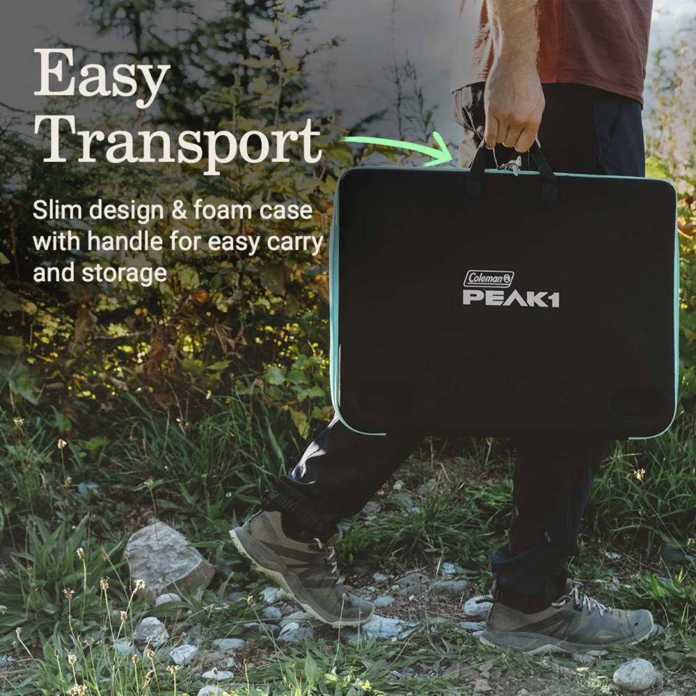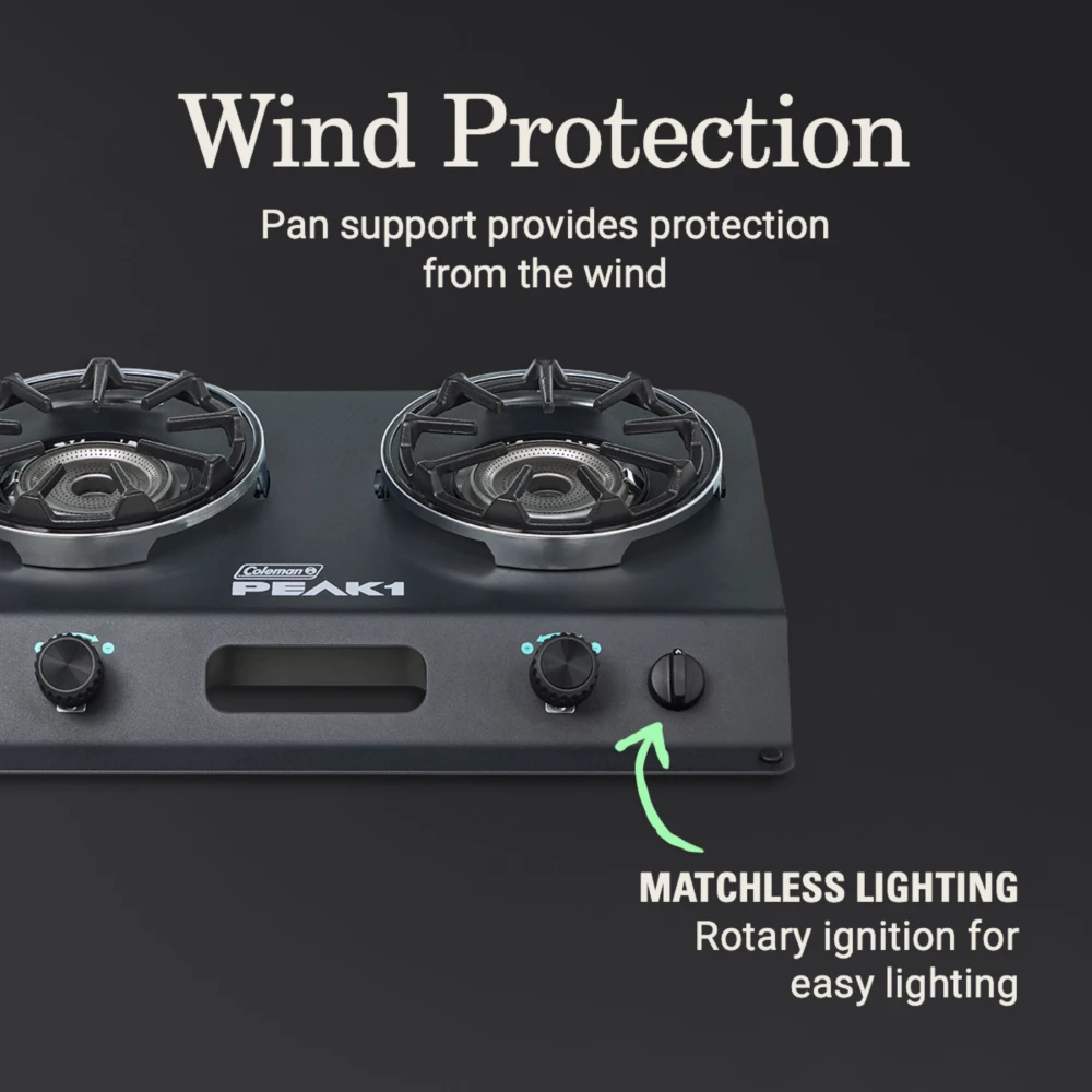 Elevate your next camping trip with the PEAK1™ Collection—premium gear designed to inspire and built for those making the most of the outside. Influenced by up-mountain design, the PEAK1 2-Burner Camping Stove makes it easy to cook great meals outdoors. Because we know that when you’re on this adventure you’re planning the next one, we made sure the durable cast-iron design is easy to clean. Every bit of space counts when packing, so this portable stove has a slim profile to save you room, as well as a sturdy handle, and a foam case.