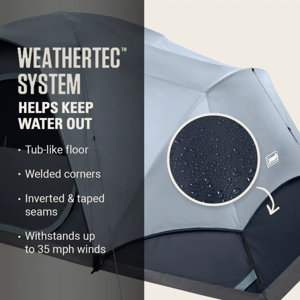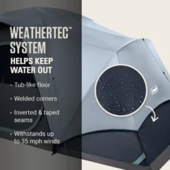 - BLOCKS WIND AND RAIN: WeatherTecâ„¢ system’s tub-like floor, welded corners, inverted seams and taped seams on rainfly and tent body help keep water from getting in; strong frame has been tested to withstand up to 35 mph winds