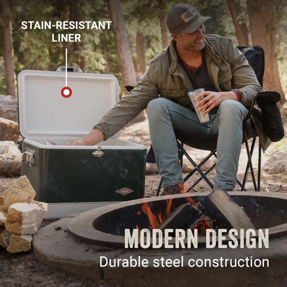 Add a retro vibe to your next backyard BBQ, family picnic, or beach day with the ColemanĀ® Vintage 54-Quart Steel BeltedĀ® Cooler. A throwback to the classic 1954 design, the cooler evokes memories of outdoor adventure but with modern features you can enjoy today. With enough room to hold up to 84 cans, youāll have plenty of drinks to go around and the cooler Keeps the Ice⢠for up to 4 days. The Have-A-Seat⢠lid supports up to 250 lbs. so youāll always have an extra seat. Carry the cooler from your garage to the backyard or your trunk to the park easily using the comfort-grip handles. The rust-resistant stainless steel hardware helps you enjoy the cooler for years to come.